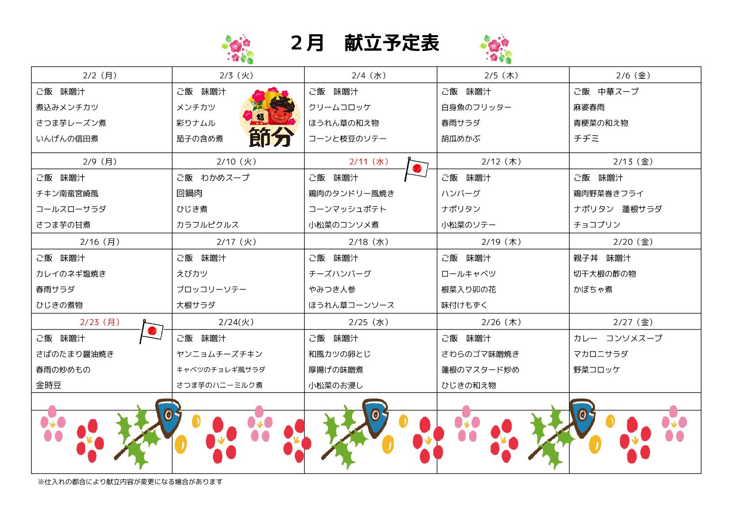 2月の献立になります!