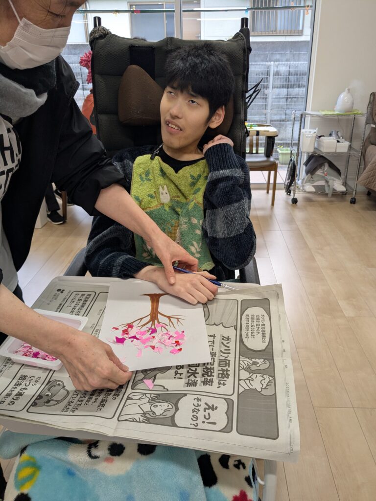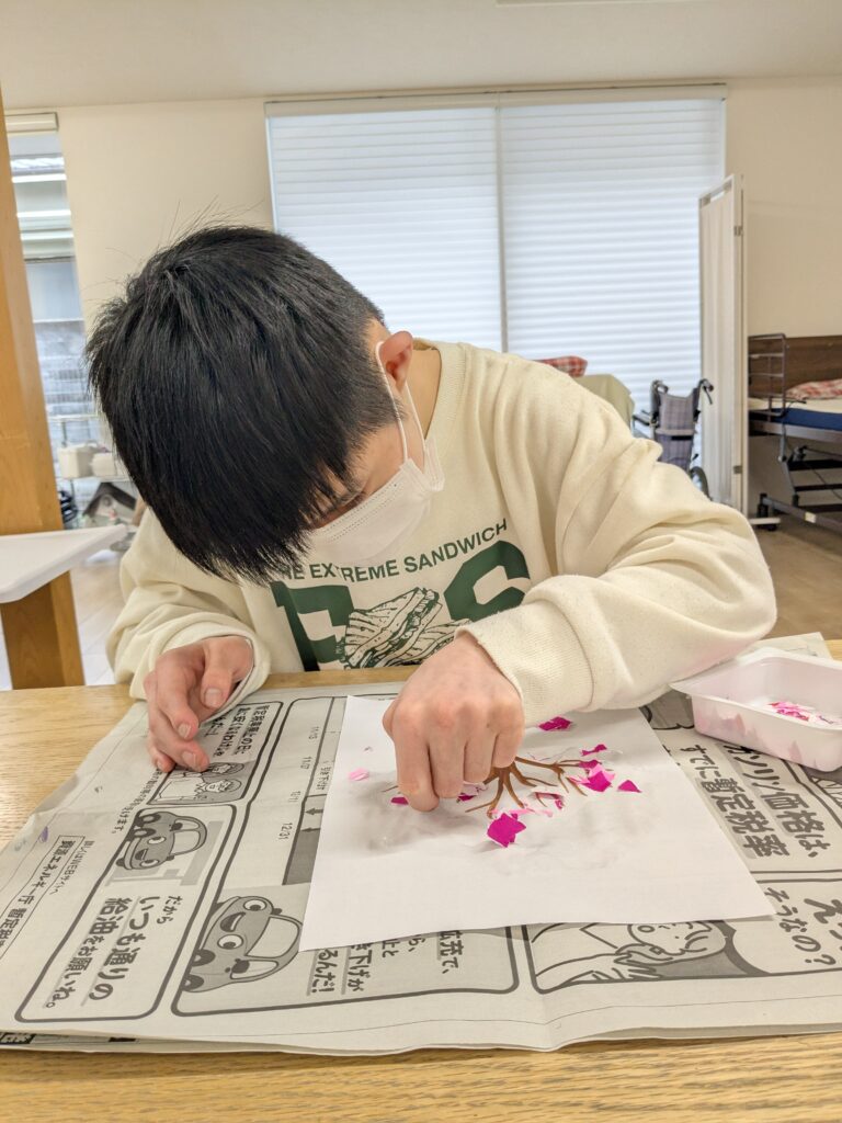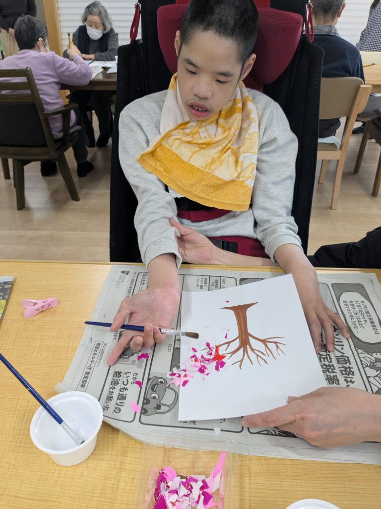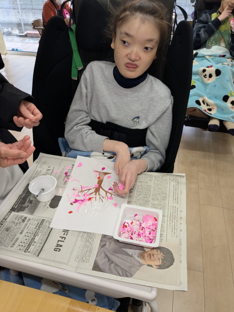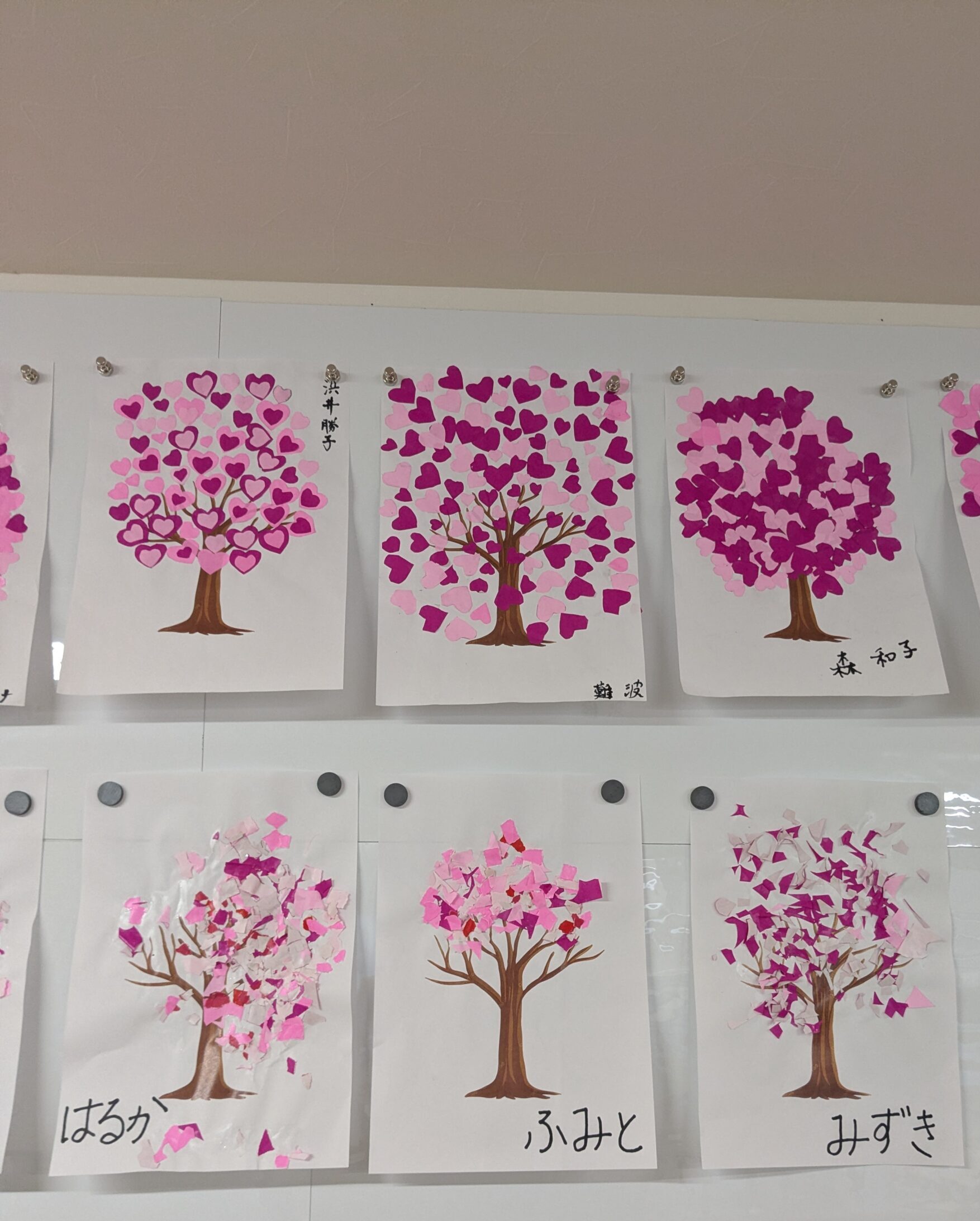 桜は赤やピンクの折り紙をハート型に切り抜き桜の花びらを表現しました